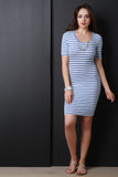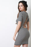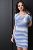 This stylish bodycon dress features horizontal stripes, scoop neckline, short sleeves, and criss-cross lace back. Accessories sold separately. Made in U.S.A. 95% Rayon, 5% Spandex.