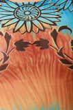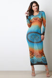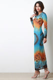 This maxi dress features semi-sheer mesh, tie dye boho print, round neckline, and long sleeves. Accessories sold separately. Made in U.S.A. 95% Polyester, 5% Spandex.