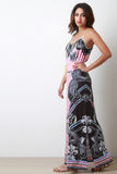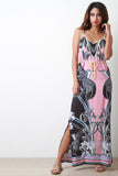 This maxi dress features and engineered floral and hummingbird mirrored print, v neckline, deep v back, contrast binding, adjustable spaghetti straps, waist tie belt, finished with a double side slit. Accessories sold separately. 100% Rayon.