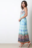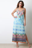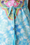 This maxi dress features and engineered floral and tie dye print, v neckline, deep v back, adjustable spaghetti straps, waist tie with tassel detail, finished with a double side slit. Accessories sold separately. 100% Polyester.