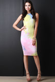 This jersey knit bodycon dress features a seamless round neckline, sleeveless, stretchy sculpture fit, midi length hemline, fully lined, and pastel tie dye pattern print. Accessories sold separately. Made in U.S.A. 95% Rayon, 5% Spandex.