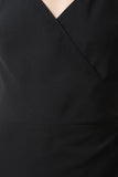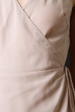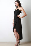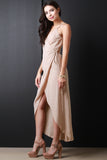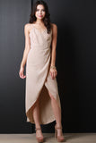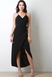This simply chic maxi dress features a surplice neckline, spaghetti shoulder straps, v-back, high waisted cinched seam, wrap constructed design with self-tie sash at waist, and an overlapping asymmetrical hemline. Accessories sold separately. Made in U.S.A. 100% Polyester.