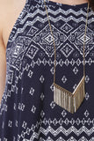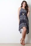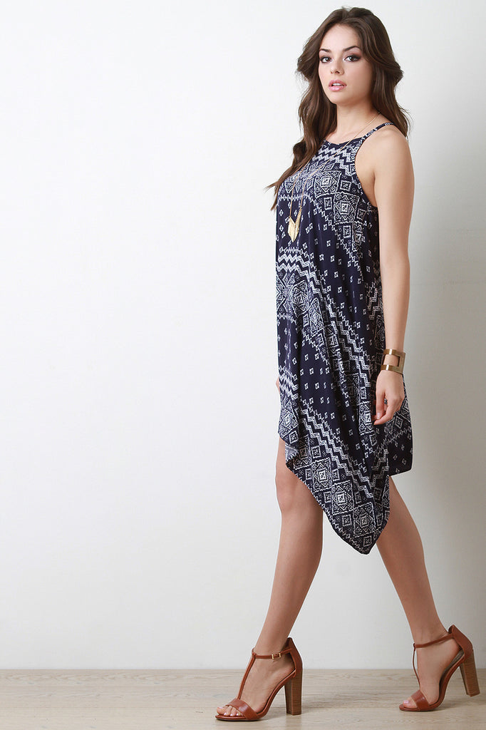 This midi dress features bandana print, sleeveless construction, relaxed fit, and handkerchief hemline. Accessories sold separately. Made in U.S.A. 100% Rayon.
