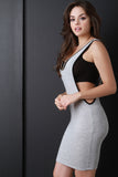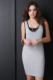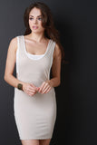 This sporty dress features a soft knit fabrication, contrast trim, built in crop top, low cut armholes and back, scoop neckline, bodycon fit with a mini length hemline. Accessories sold separately. Made in U.S.A. 96% Rayon, 4% Spandex.
