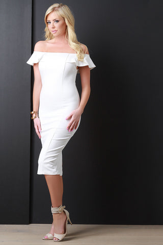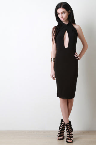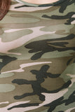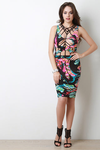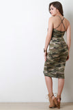This dress features camouflage print on jersey knit fabrication, spaghetti shoulder straps to a crisscross back, sculpture fit, and midi length hemline. Accessories sold separately. Made in U.S.A. 96% Rayon, 4% Spandex.