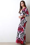 This beautiful dress features a woven fabrication with tie dye and bulgari print, surplice v-neckline, three quarter sleeves, and self-tie waist sash. Finished with a maxi-length hemline. Accessories sold separately. Made in U.S.A. 95% Polyester, 5% Spandex.