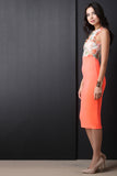 This bold bodycon dress features a floral printed mash lace top, high neckline, sleeveless design, solid knit skirt, with a midi length hemline. Accessories sold separately Made in U.S.A. 60% Polyester, 40% Nylon.