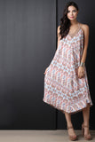 This dress features a v-neckline with embroidery lace trimming, spaghetti self-tie halter straps, backless design, trapeze cut fit, midi length, and tribal pattern print throughout. Accessories sold separately. 100% Polyester.