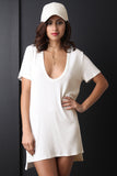 This shift dress features a scoop neckline, short sleeves, vertical ribbed knit fabrication, boxy cut fit, side vent slits, and a high low hemline. Accessories sold separately. 46% Rayon, 46% Rayon Sub, 8% Lycra.