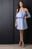 This dress features a off the shoulder neckline, short bell sleeves, elastic waist, lager single ruffle detail, and crochet trim at the hemline and sleeves. Accessories sold separately. 100% Cotton.