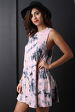 This jersey knit dress features a crew neckline, sleeveless, blotchy tie-dye pattern, and trapeze cut fit. Accessories sold separately. 95% Rayon, 5% Spandex.