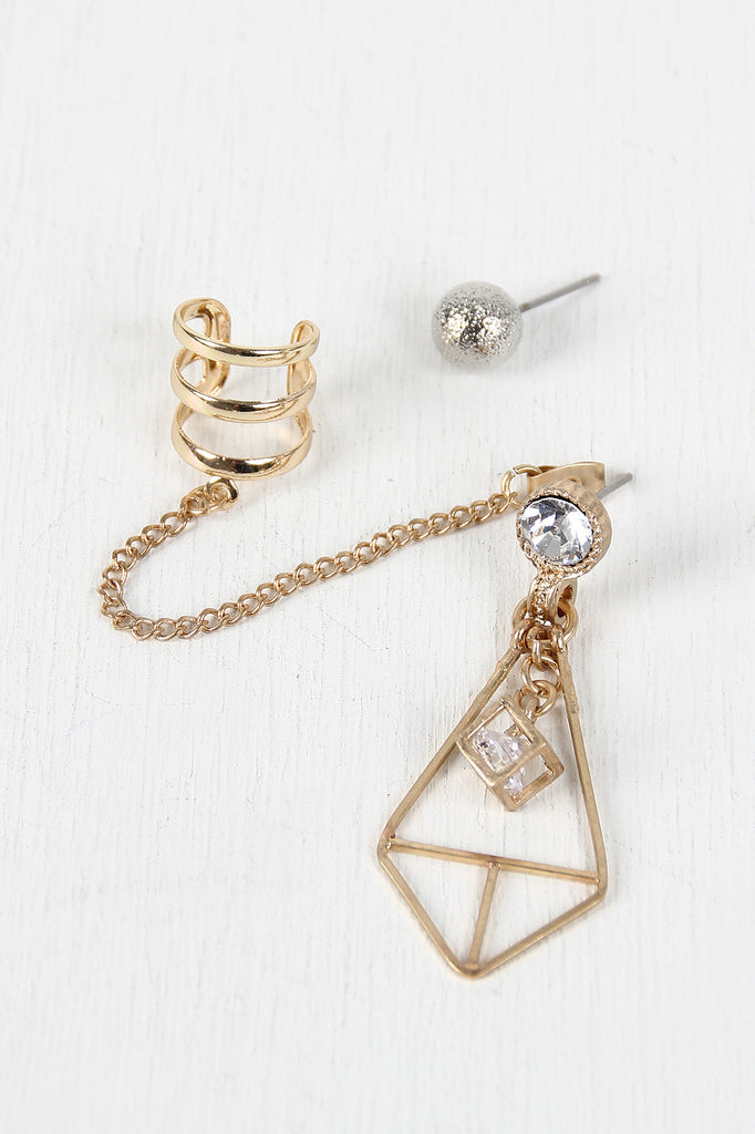 This mismatched pair of earrings features a silver-tone sanded ball stud, a geometric shape earring with rhinestone accents and hanging cube charm, and an ear cuff attached by thin curb link chain to an earring back. Finished with post backs.