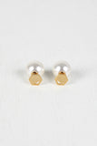 These trendy post double-sided earrings feature a brushed metal hexagon front with triangle cutout and large faux pearl back.