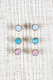 A set of three pairs of earrings featuring round cut faux gems, textured glossy bezels, and post backs.