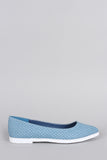 This comfy loafer flat features a star print denim upper, pointy toe silhouette, contrast color sole, lightly cushioned insole with stripe accent, and easy slip-on construction.