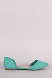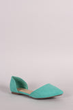 This dorsay flat features a soft vegan suede upper, pointy toe silhouette, open sides, lightly padded insole, and easy slip-on construction.