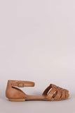 A vegan leather d'Orsay flat featuring a woven front, peep toe, and adjustable ankle strap. Finished with a lightly padded insole.