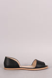 This stylish flat features a peep toe silhouette, open shanks, lightly padded insole, and easy slip on construction.