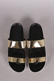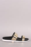 This flat sandal features double band with metallic finish, open toe silhoutte, lug sole, and easy slip on construction.