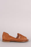 This adorable flat features a peep toe silhouette, strappy woven design throughout, lightly padded insole, and easy slip-on construction.