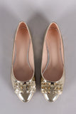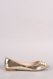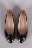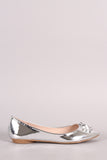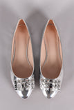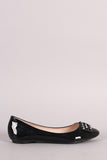 This sweet ballet flat features a glossy patent adorned with a pyramid studded bow at the front. Finished with an almond toe silhouette, lightly cushioned insole, and easy slip-on style.
