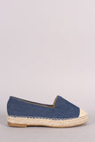This comfy loafer flat features a woven design at toe, denim upper with partial elastic insert, braided espadrille accent along the edge, and cushioned insole for comfort.