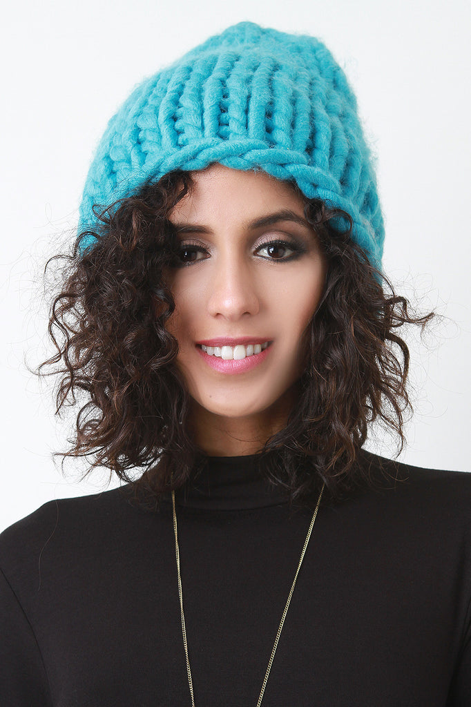 An oversize chunky knit beanie in bright solid coloring. 100% Acrylic.