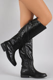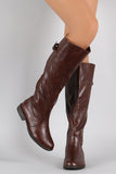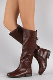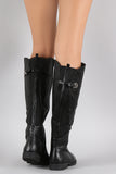 These fashion-forward knee high boots feature a round toe silhouette, vegan leather shaft with partial elastic gore insert, buckle strap detail, top stitching accents, and low heel. Finished with cushioned insole, soft interior lining, and full-length side zipper closure for easy on/off.