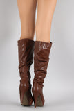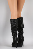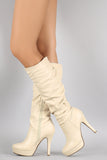 These stunning knee high boots feature an almond toe silhouette, slouchy shaft design, tribute platform, and wrapped heel. Finished with cushioned insole, soft faux fur interior lining, and partial side zipper closure for easy on/off.