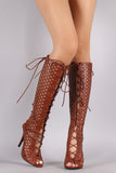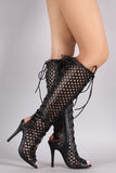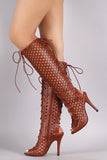 These stunning knee high boots feature a perforated design with corset-style lace up closure at front and back. Also features a peep toe silhouette, wrapped stiletto heel, and full-length side zipper closure. Finished with cushioned insole for comfort.