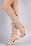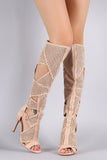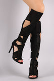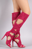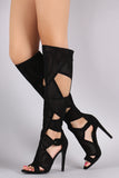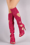 These edgy knee high boots feature a smooth vegan suede upper with perforated detail, open toe silhouette, and cutouts design with buckle accents. Finished with wrapped stiletto heel, lightly padded insole, and convenient back-zip closure.