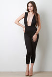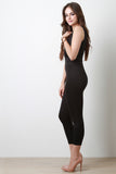 This sleeveless jumpsuit features a square neck and back, ruching seam a high waisted panel, stretchy fitted pants, finished with a zipper fastener at rear. Accessories sold separately. Made in U.S.A. 95% Polyester, 5% Spandex.