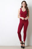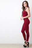 This jersey knit leotard jumpsuit features a round neckline, sleeveless design, sculpture silhouette fit, and taper cut legs. Accessories sold separately. Made in U.S.A. 95% Cotton, 5% Spandex.