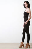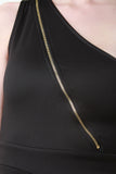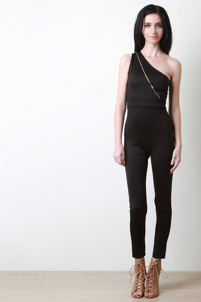 This jumpsuit features a one shoulder neckline, with a diagonal zipper fastener front for opening option, high waisted cinched panel seam, taper cut legs, and zipper fastener at back. Made in U.S.A. Accessories sold separately. 96% Cotton, 4% Spandex.