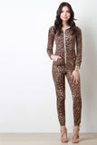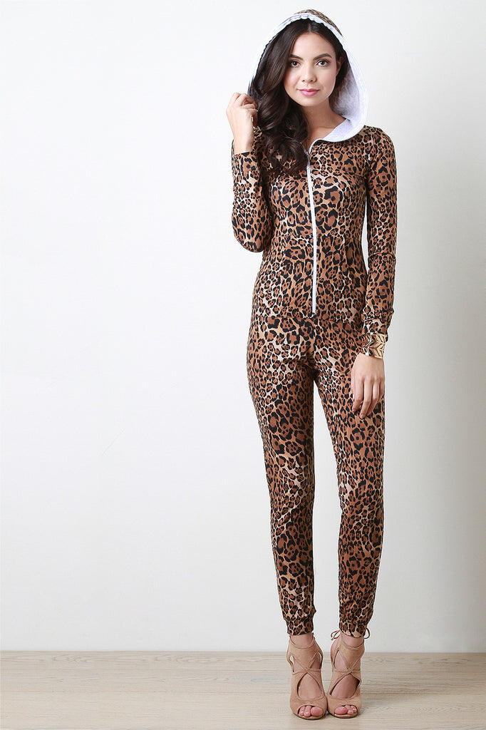 This jersey knit jumpsuit features an attached hood with contrasting zip-up front, long cuff sleeves, kangaroo pockets, and jogger pants. Accessories sold separately. Made in U.S.A. 95% Cotton, 5% Spandex.