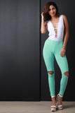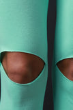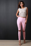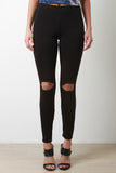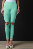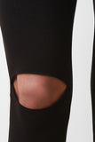 These solid casual leggings feature an elasticized waistband, and figure flattering tapered cut legs. Finished with lasercut slits along the knees. Accessories sold separately. Made in U.S.A. 96% Cotton, 4% Spandex.