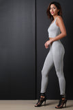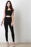 This casual jumpsuit features a jersey knit fabrication, sleeveless construction, scoop neckline, with a hemmed midriff cutout and curve hugging fit. Accessories sold separately. Made in U.S.A. 95% Rayon, 5% Spandex.