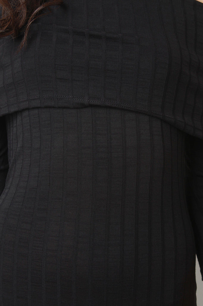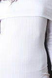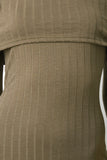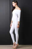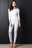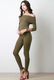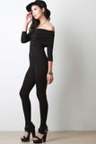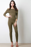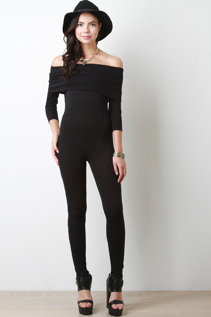 This jumpsuit features ribbed knit fabrication, fold over off-the-shoulder neckline, three quarter sleeves, and taper cut legs. Accessories sold separately. Made in U.S.A. 60% Polyester, 40% Nylon.