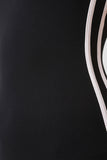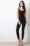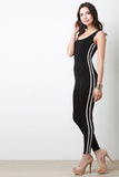 This sleeveless jumpsuit features a stretchy knit fabrication, scoop neckline with deep-v back, contrasting striped detail along side, and taper cut legs. Accessories sold separately. Made in U.S.A. 95% Rayon, 5% Spandex.