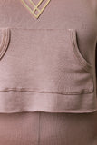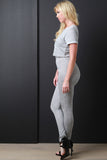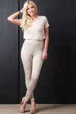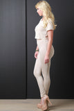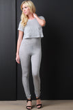 This soft jersey knit jumpsuit features a crop top tier construction, round neckline, short sleeves, kangaroo pocket, and tight legging bottom. Accessories sold separately. Made in U.S.A. 62% Polyester, 33% Rayon, 5% Spandex.