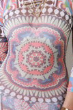 This jumpsuit features abstract floral medallion print on semi-sheer mesh fabrication, round neckline, long sleeves, keyhole back, and a single button closure at nape. Accessories sold separately. Made in U.S.A. 95% Rayon, 5% Spandex.