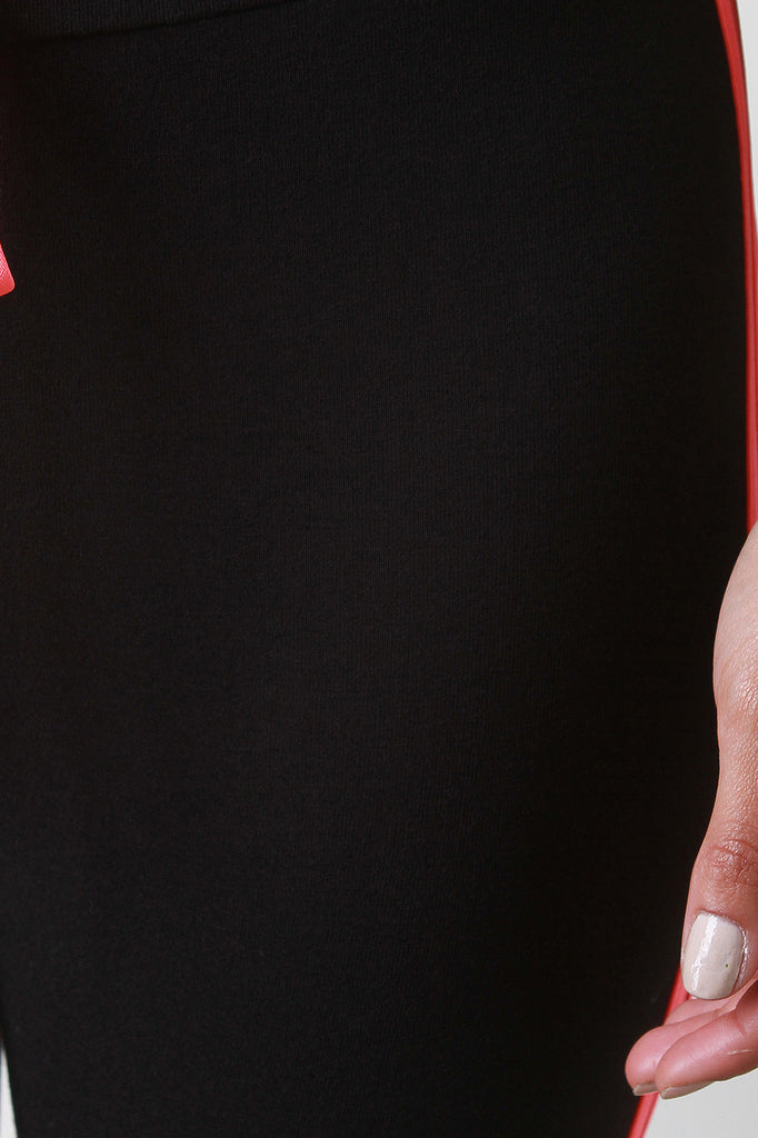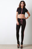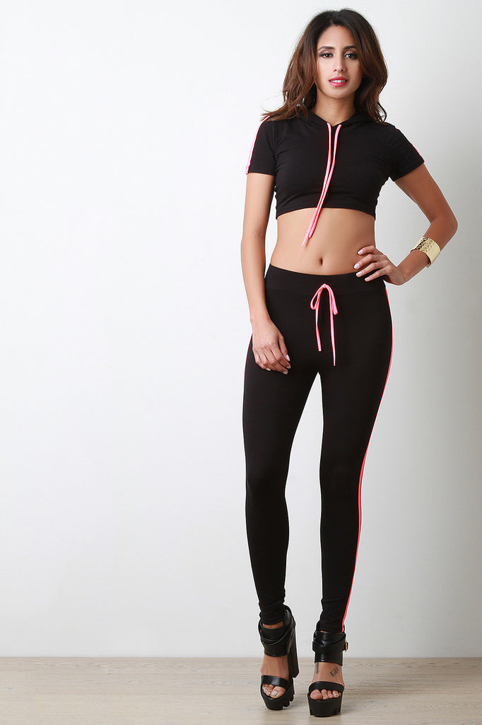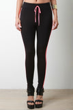 These sporty leggings feature a wide elastic waistband, faux drawstring, double sewn on stripe on both sides, tapered leg. Accessories sold separately. Made in U.S.A. 95% Cotton, 5% Spandex.