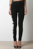 These leggings feature smooth stretchy knit fabrication, "WORK WORK" graphic print on one side, wide elasticized waist band, and taper cut legs. Accessories sold separately. 100% Polyester.