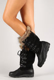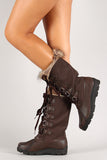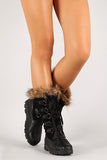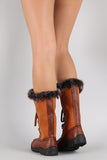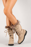 These mid calf boots features a round toe silhouette, soft faux fur trim at collar, d-rings with lace up closure, and low heel. Finished with cushioned insole and soft interior lining for all day comfort.