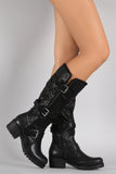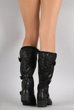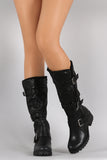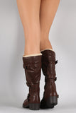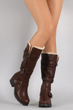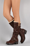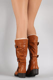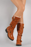 These stylish boots feature a round toe silhouette, triple buckles strap detail on shaft, stitching accents, shearling lining at cuff with slits, and low block heel. Finished with cushioned insole, soft faux fur interior lining, and full-length side zipper closure for easy on/off.