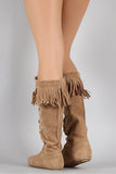 These stylish fringe starting from the cuff of the boot draping down. Finished with lace up on the front for closure.