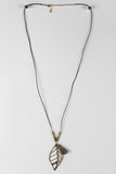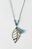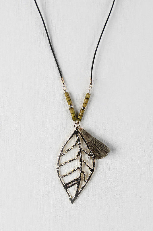 This piece of necklace with a cut out leaf design along with a tassel attached to the leaf and beads tying together the necklace and the pendant. The necklace is a string with glossy paint over it. Finished with a lobster claw for closure.