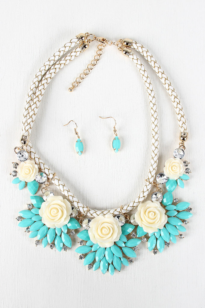 A double woven rope necklace with glossy metallic trim, acrylic roses, and petal-shape faceted gems. Finished with rhinestone accents and adjustable lobster hook closure. Necklace includes matching earrings. Lead and nickel free.