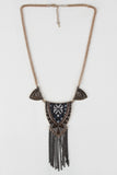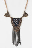 This tribal necklace features engraved patterns , a shield shape with fabric outlined with beads, and long metallic curb link fringe. The curb link chain has an adjustable lobster hook closure.