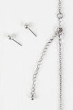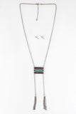 A long necklace featuring jointed metallic bars at the center with hammered textures, colorful sand embellishment, and curb chain tassels. Finished with glossy cable chain, adjustable lobster hook closure, and matching earrings. Lead and nickel compliant.